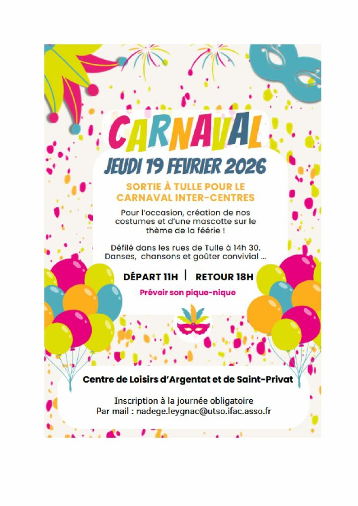 Les centres de loisirs participeront au Carnaval inter-centres qui aura lieu à Tulle le jeudi 19 février 2026, aux côtés des centres d’Argentat et de Saint-Privat.